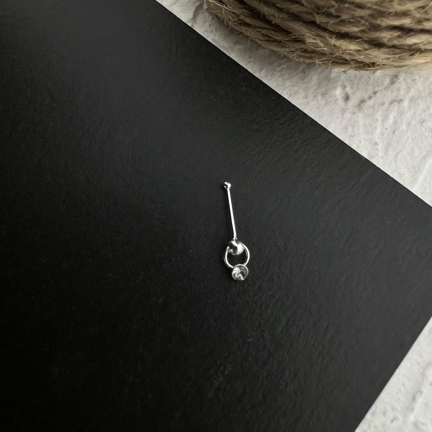 جنس نقره و ابعاد : میله حدود 10 میلیمتر و سر پیرسینگ حدود دو میلیمتر / رنگ ثابت و ضد حساسیت