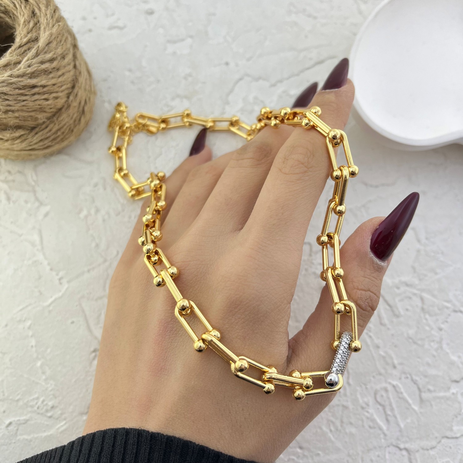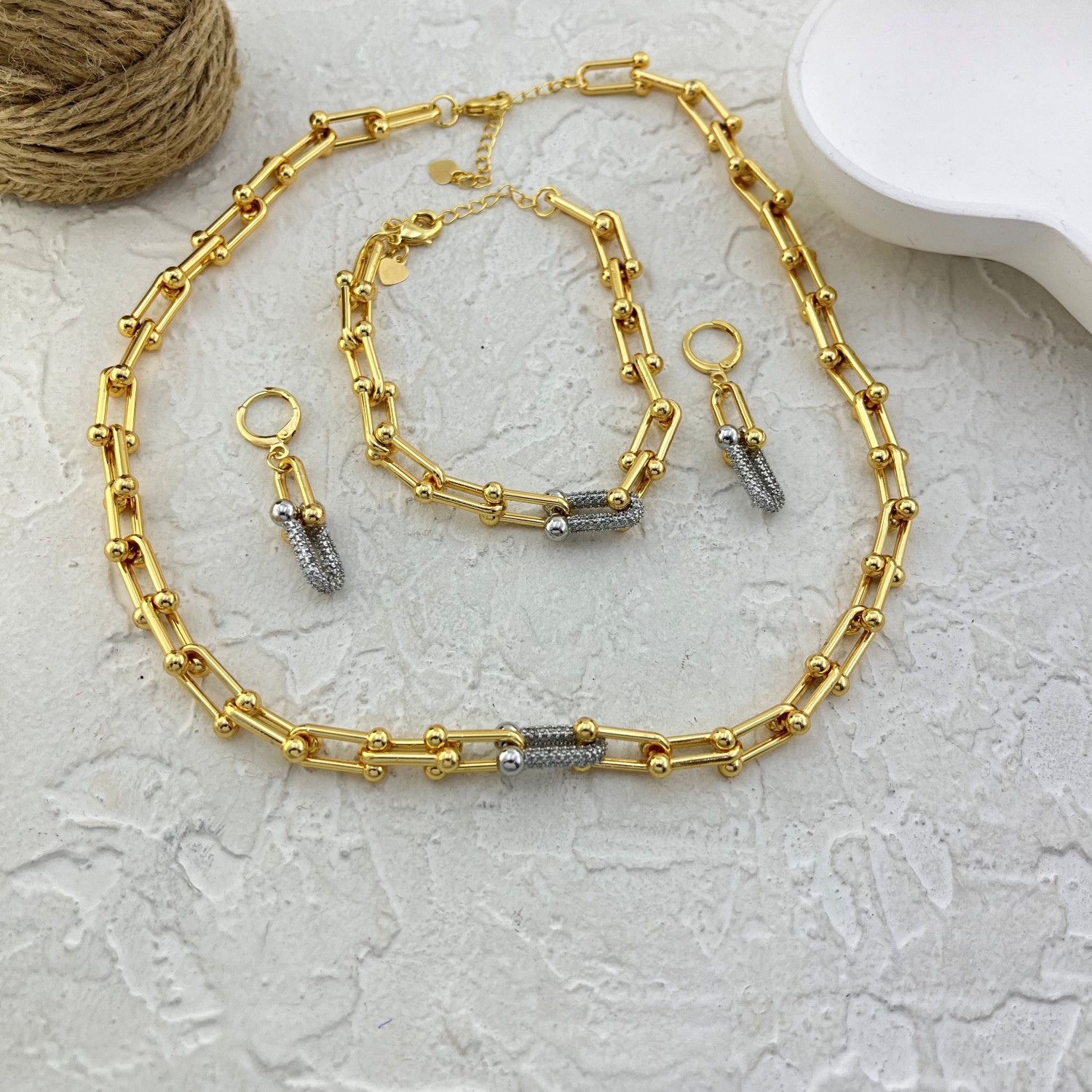 45 سانتیمتر زنجیر و پهنا حدود 7 میلیمتر و دستبند 20 سانتیمتر در 7 میلیمتر و گوشواره حدود 4 سانتیمتر در 7 میلیمتر / رنگ ثابت و ضد حساسیت